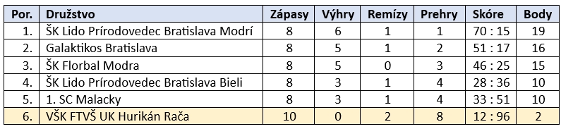 • VŠK FTVŠ UK Hurikán Rača — ŠK Lido Prírodovedec Bratislava Modrí 1 : 12 (1 : 3, 0 : 4, 0 : 5)