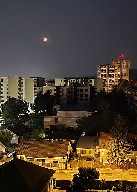 Nad mestskou časťou Rača bolo možné sledovať vesmírne divadlo už nad ránom okolo 03:00 hod. a z uvedeného času pochádzajú aj obe zobrazené snímky. Neskôr oblohu pokryla prevažne zväčšená oblačnosť a priame pozorovanie tak nebolo možné. Presný čas jahodového splnu nastal o 09:44 hod., ale farba Mesiaca zostávala nezmenená, žiadny farebný jahodovoružový závoj si nenavliekol.